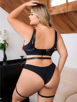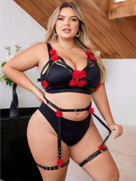 This set includes a waist-hugging floral belt and dual thigh harnesses, each blooming with red appliqué and anchored by adjustable straps that invite both movement and control.